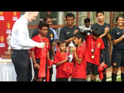 Below under 12 player from Pune city (Pune FC) Pranav Kale taking a cup for the Manchester United Soccer School's Mumbai Skills Final 2013